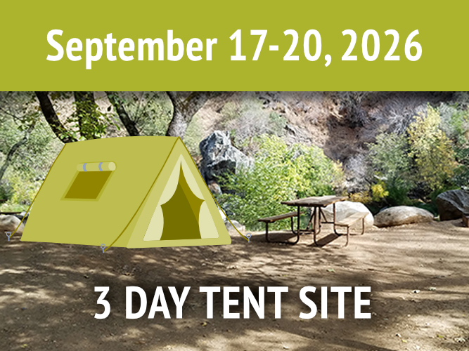Important: Check in time is 10:00 a.m. Thursday morning. Three day tent site includes a picnic table and an in-ground fire pit/grill. It also includes our famous Saturday night cook-out. Enjoy exploring the river, fishing, swimming, gold mining, and more. All of this plus the best mining in the Mother Lode! Bag of gold bearing dirt available in the Trading Post. Reservations are required.